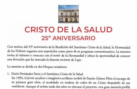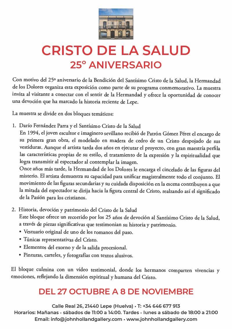 Título: INAUGURACIÓN EXPOSICIÓN 25º ANIVERSARIO CRISTO DE LA SALUDO.Imagen principal: Fecha: Lunes, Octubre 27, 2025 - 20:00Categoría evento: Cultura