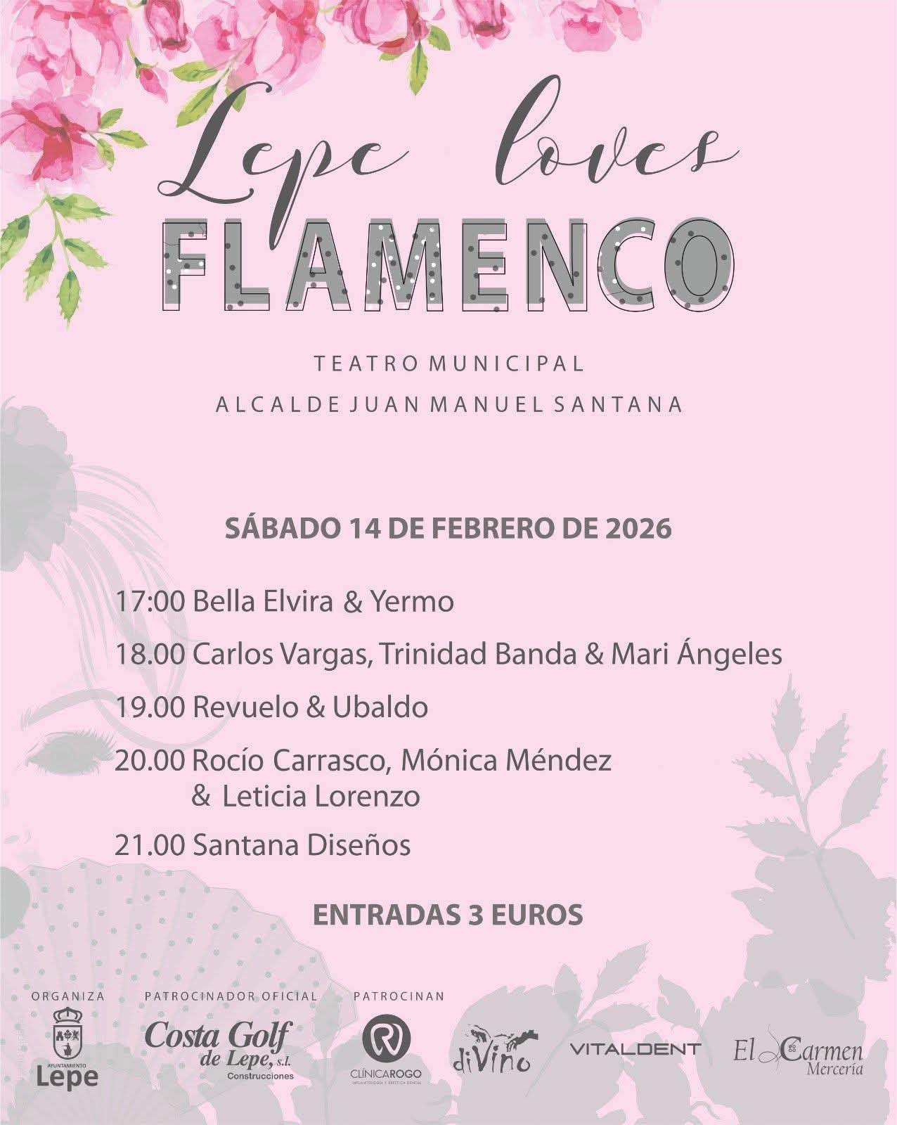 Título: Lepe Loves FlamencoImagen principal: Descripción: Si tiene alguna duda sobre un evento en cuanto a accesibilidad o necesidades especiales, contacte con la oficina de turismo de Lepe. Fecha: Sábado, Febrero 14, 2026 - 17:00Categoría evento: Cultura