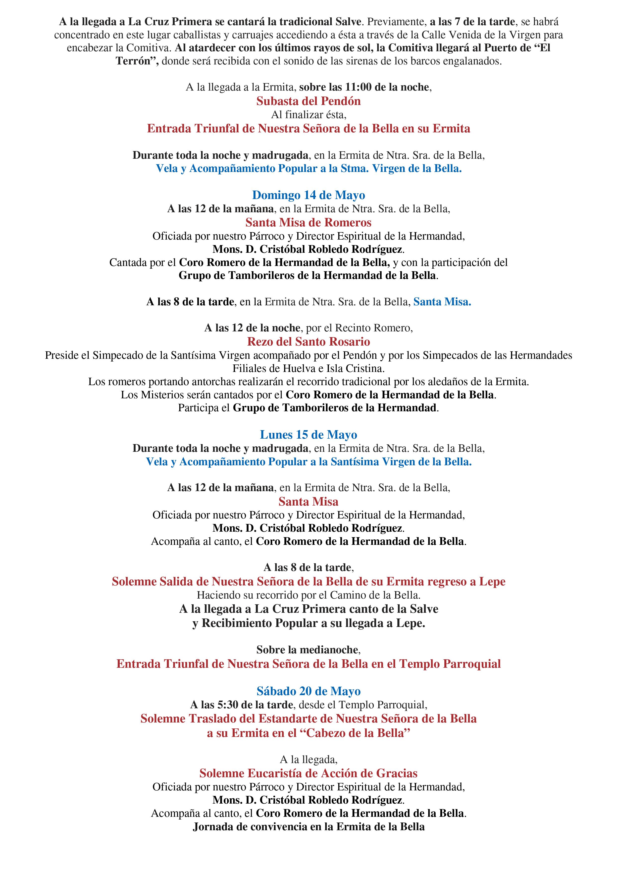 Durante toda la noche y madrugada, en la Ermita de Nuestra Señora de la Bella, Vela y Acompañamiento Popular a la Stma. Virgen de la Bella.